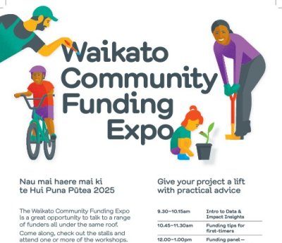 Join us at the Waikato Community Funding Expo on Wednesday, 5 November, held at the Hamilton Gardens Pavilion from 9am to 3pm. No registration required, just come along!
